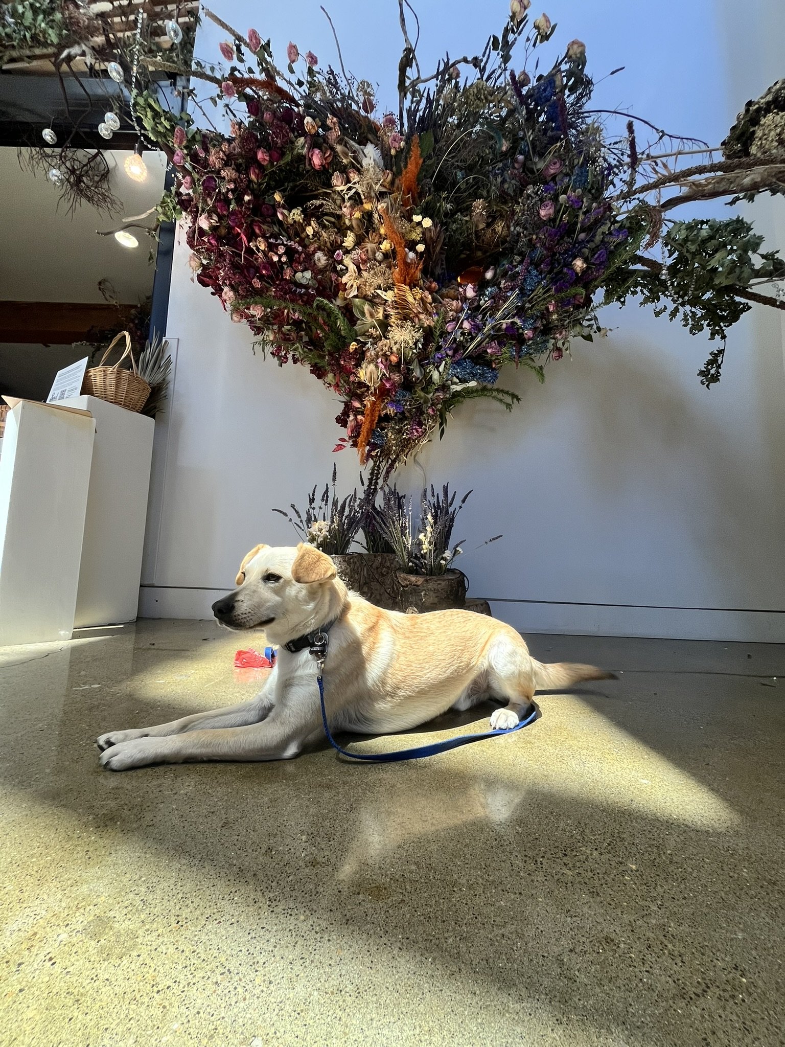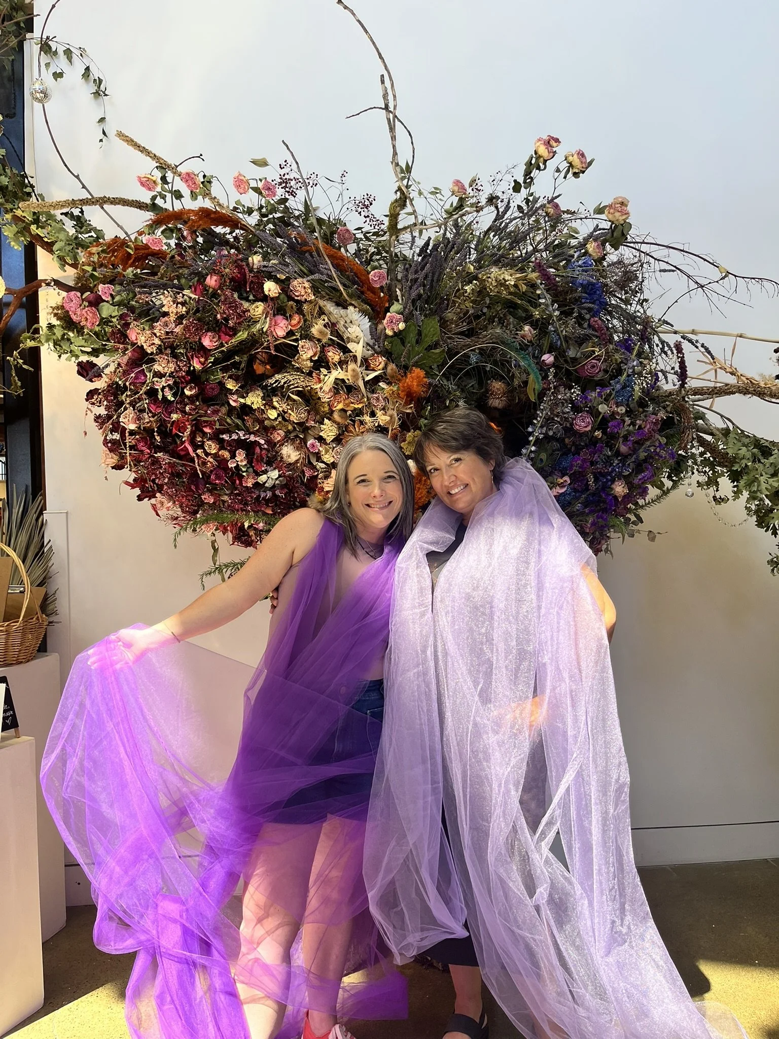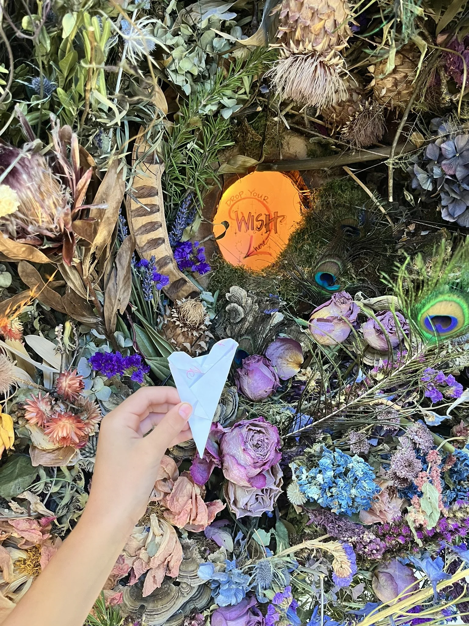 While the new heart has fresh flowers, Big Mama represents the wisdom, abundance and variety that comes with age and experience. She has been filled over and over again with flowers from very special events, and this latest layer is no exception. There are so many beautiful roses, amaranth, straw flowers, hydrangea, peony, delphinium, teasel, nandina, mushrooms and more. Come see! And smell, of course. Take it alllll in.