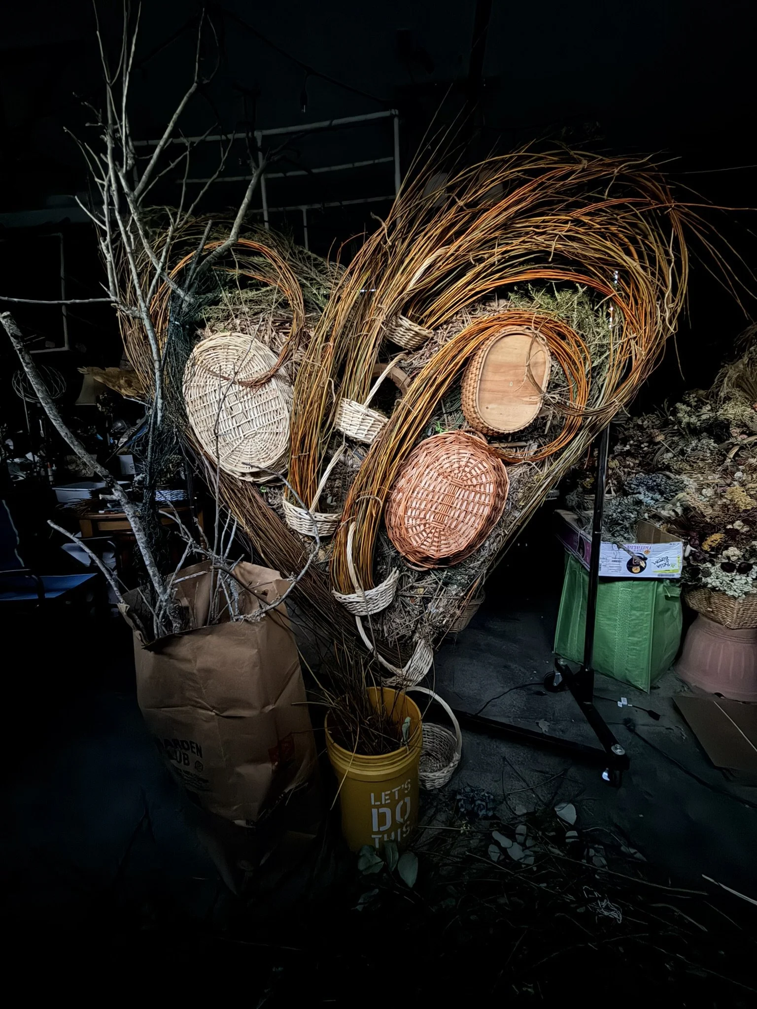 For the Home and Garden Show, Big Mama is showing us how fun it can be to create beauty in the breakdown. On one side, you'll find a yard debris bag and bucket swirling into the air. Baskets have been embedded into her body to hold live pansies and waves of dried willow, cypress, rhododendron, sedum, laurel and fall leaves. On the other side, the swirl of yard debris settles into a basket on the table which is full of dried flowers. This side is loaded with a spiral of whites and yellows, a heart of reds and pinks, and splashes of blues, purples and greens throughout. Take a close look and see how many different varieties you can identify! The diversity that grows in the PNW is so amazing to play with.