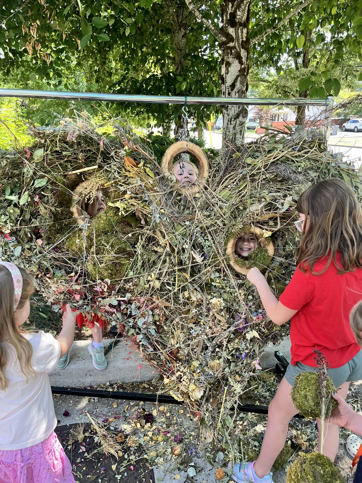 Being made from a bundle of branches and stems, she is the perfect base to slide new blooms into without any need for glue. Everything holds onto each other. Even the fresh layers of flowers are simply tucked in so that they can be easily removed for art classes and updates. Big Mama is the most magical flower dispenser! She smells fabulous when she's being worked with, as her rosemary, roses and other fragrant herbs wake up to waft around her.